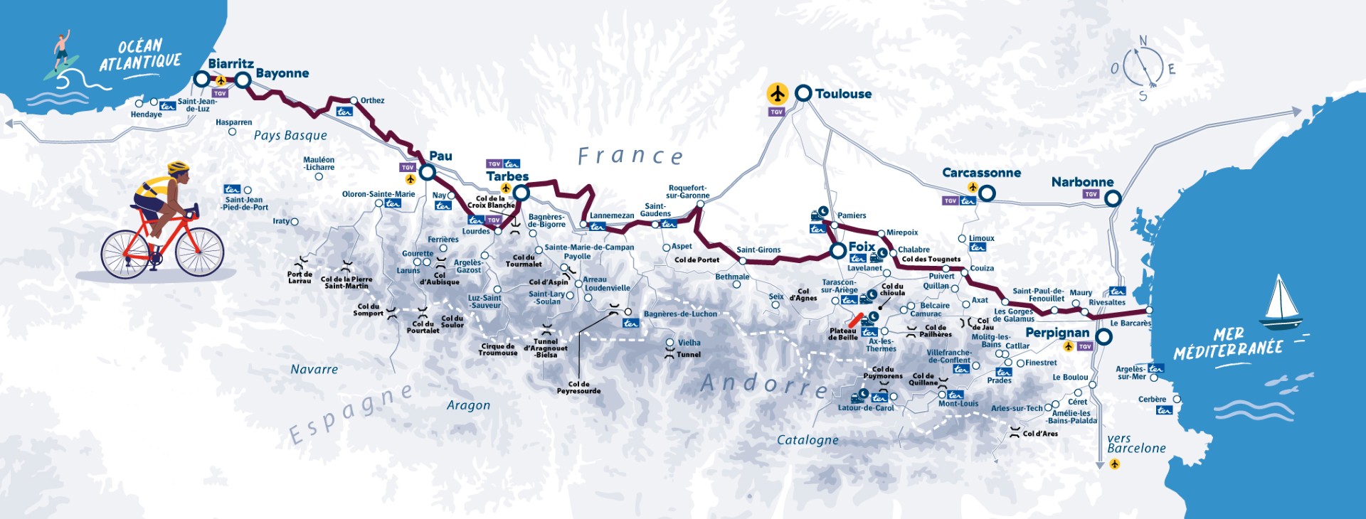 Reliant l’Atlantique à la Méditerranée, des vagues de Biarritz / Anglet des plages du Barcarès, avec en toile de fond les majestueux panoramas du massif des Pyrénées, LA VÉLOSUD vous emmène, entre autres trésors, de villages en vignobles, de vallées en rivières, de plaines en collines, entre culture catalane, histoire cathare et traditions basques. Un voyage de 658 km et en 13 étapes qui ont toutes en commun la beauté, l’authenticité, la gourmandise, l’hospitalité et l’inimitable accent chantant dans ce grand Sud / Sud Ouest de France.